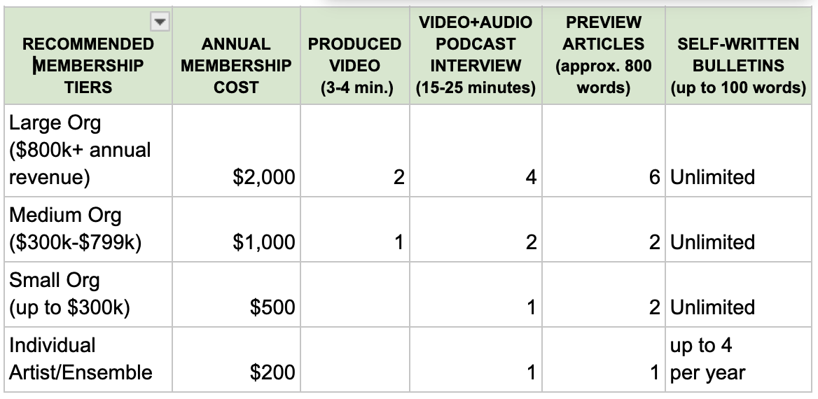 Here’s what’s groundbreaking about our model: Our base funding will come from annual memberships paid for by the arts organizations our journalism supports. Advertising and foundation/government grants will also play important roles in our revenue.